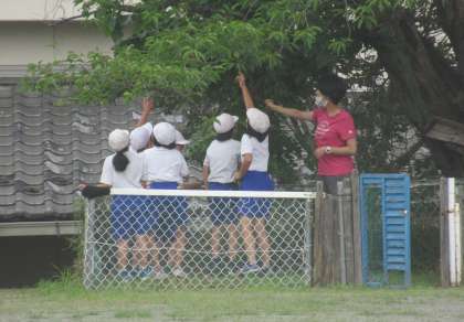 (写真下)体育集会のあと、少し雨が降ってきたので、4年生が今日は校庭にある桑の木からカイコのえさを採っていました。4年生の愛情でカイコたちもすくすくと育っています。