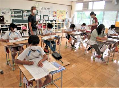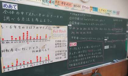 6月23日(木) 6年生の算数 公開日 2022/06/23 更新日 2022/06/23 できごと 2校時、6年生の算数では、「中央値(データを大きさの順に並べたとき真ん中にある値)」について学習していました。教科書の問題を解いて今日のめあてに迫り、「ふり返り」では算数ドリルの問題に挑戦しました。