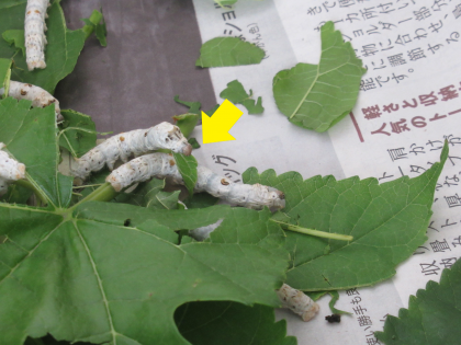 (写真上)ちょうど桑の葉を口にくわえて食べていました。