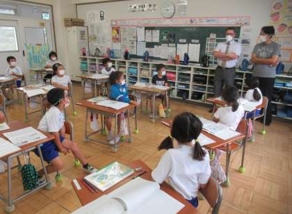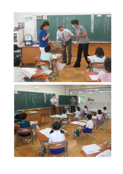 (写真上・中)2年生の教室に行くと、国語で「こんなもの 見つけたよ」の発表をしていました。生活科の時間に校庭で見つけた生き物についての発表でした。最後に発表した児童が「カマキリ」についての発表だったので、「英語でカマキリは何て言うのだろう?」「カナダにカマキリはいるのかな?」等々、2年生の質問タイムがスタートしました。