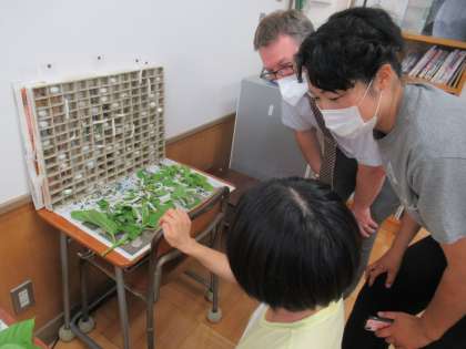 (写真中2枚)子供たちが手のひらにカイコをのせてくれました。初めてカイコと触れ合うゲストはたいへん感激していました。するとゲストからカイコについての質問が出ました。子供たちは、これまでタブレットPCに撮りためてきたカイコの成長記録をゲストに見せていました。