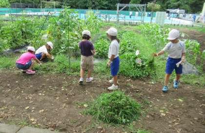 7月5日(火) 2年生の生活科(1) 公開日 2022/07/06 更新日 2022/07/06 できごと (写真上・中)1校時、2年生は生活科の時間に、野菜を育てている学級園(畑)の草むしりをしていました。こうした子供たちの日頃の活動で、野菜がたくさん育っています。これも大事な学びです。 (写真下)スイカの周りに集まって何をしているのかなとのぞいたら、担任と子供たちでスイカの受粉作業(黄色枠)をしていました。たくさんスイカが実りそうです。
