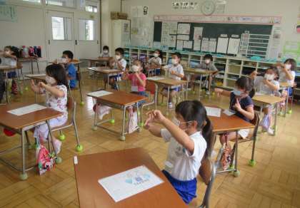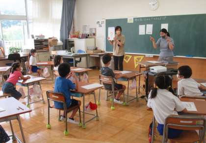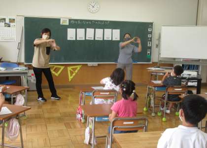 9月1日(木) 2年生の外国語活動 公開日 2022/09/01 更新日 2022/09/01 できごと 2校時、2年生の外国語活動では、担任・ALT(外国語指導助手)の先生と一緒に、形の英語表現を学び、その英語を言いながら楽しくゲームを行っていました。英語を発音する2年生の声はとても元気です。