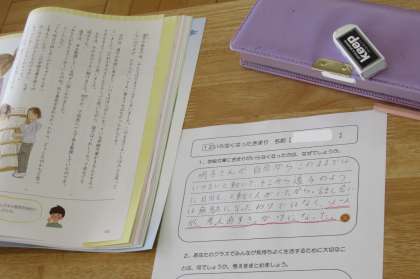(写真下)一人一人の子供たちの「気付き」には、担任から朱線が引かれシールが貼られました。