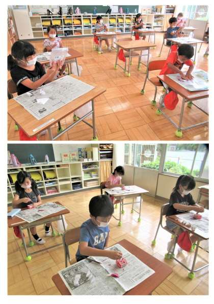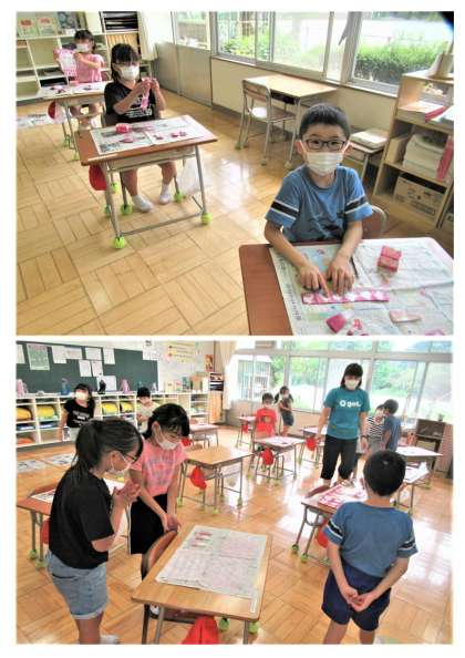 このあと(次時)は、染めた紙を使って、「しおり」や「花」づくりに取り組みます。作品の完成が楽しみです。