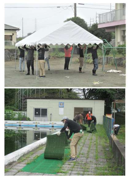 (写真下)今週からスタートする運動会練習に向けて、暑さ対策のテントを組み立てていただきました。また、プールサイドの片付けもお世話になりました。