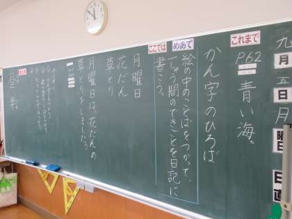 9月5日(月) 2年生の国語 公開日 2022/09/05 更新日 2022/09/05 できごと 4校時、2年生の国語では、めあて「絵の中の言葉を使って、1週間のできごとを日記に書こう」の学習に取り組んでいました。2年生の子供たち、ノートに書く字がていねいです。