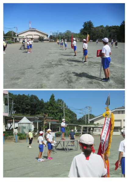 (写真上2枚)団長・副団長が集まって、運動会の開会式の練習をしていました。