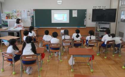 9月8日(木) 業前「朝読書」 公開日 2022/09/08 更新日 2022/09/08 できごと 今朝の校庭は、昨夜から降り続いた雨で、一面水たまり状態です。業前活動に予定していた運動会練習が中止となり、朝読書の時間となりました。1年生の教室では、みんなで読み聞かせ動画を見ていました。