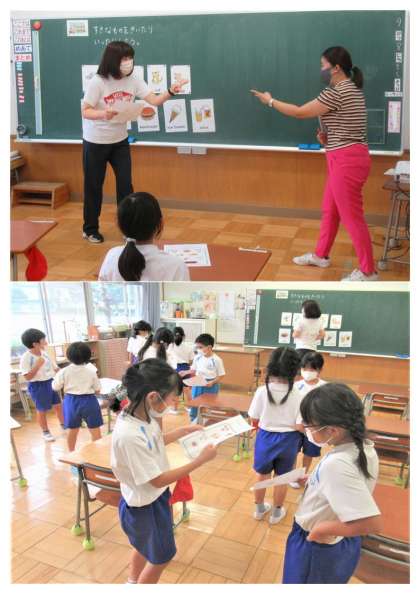 2校時、1年生は、担任・ALT(外国語指導助手)の先生と一緒に、英語に親しみました。今日は、「What do you like?(何が好きですか)」「I like ice cream.(アイスクリームが好きです)」の英語表現を使って、友だちや先生と楽しく会話をしていました。