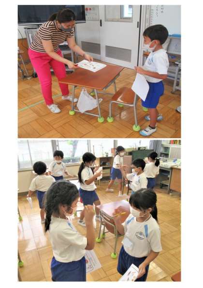 (写真下)先生が「Here you are.(どうぞ)」と言ってワークシートを渡すと、渡された子供は「Thank you.(ありがとう)」と言って受け取っていました。そのやりとりは、1年生同士、友だちへ渡すときも聞こえてきました。1年生、すごいです!