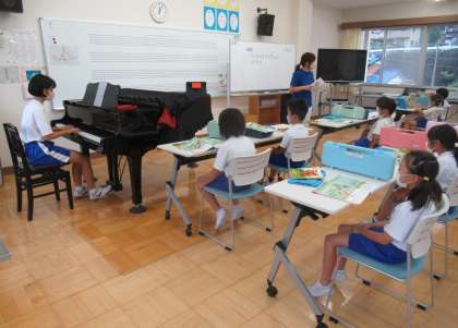 9月8日(木) 2年生の音楽(東中2年生「チャレンジウィーク4日目」) 公開日 2022/09/08 更新日 2022/09/08 できごと 4校時、2年生の音楽では、「虫のこえ」の歌を練習していました。ピアノ伴奏は、チャレンジウィーク(職場体験学習)で来ている東中2年生です。子供たちは、中学生の伴奏に合わせて、めあて「歌詞の感じを生かしながら」歌っていました。 (写真下)今日は、東中の先生が、職場体験の様子を取材に来てくださいました。東中2年生、大活躍しています。