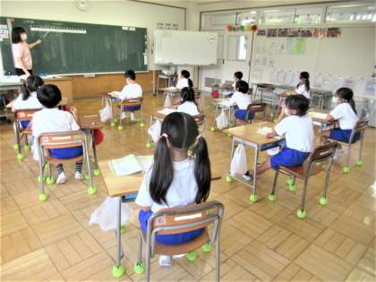 2校時、1年生の算数では、20までの数で「どちらが大きいでしょうか」の学習に取り組んでいました。先生の話をしっかり聞いて、教科書の問題に挑戦していました。