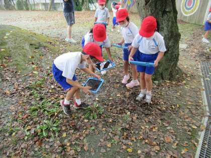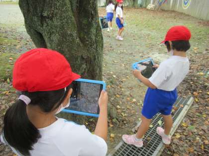 9月13日(火) 1年生の生活科 公開日 2022/09/13 更新日 2022/09/13 できごと 4校時、1年生の生活科では、めあて「校庭で秋をさがそう」の学習で、タブレットPCを持って校庭に出て、見つけた秋を写真に撮っていました。校庭を一周しながら、「あっ、バッタだ!」「キノコ見つけた」「トンボが撮れたよ!」など、みんなでたくさん秋を見つけました。一人一人が見つけた秋の写真は、教室に戻ってオクリンクで見合います。
