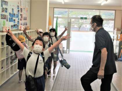 (写真下)校舎に入ると、児童玄関から業務員さんと元気にあいさつを交わす子供たちの声が聞こえてきました。子供たちとのあいさつで、気持ちよく一日がスタートします。