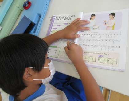 9月15日(木) 2年生の音楽 公開日 2022/09/15 更新日 2022/09/15 できごと 4校時、2年生の音楽では、めあて「リズムをかさねて楽しもう」の学習に取り組んでいました。カスタネットでリズム打ちをしたり、4分音符の書き方を練習したりしていました。