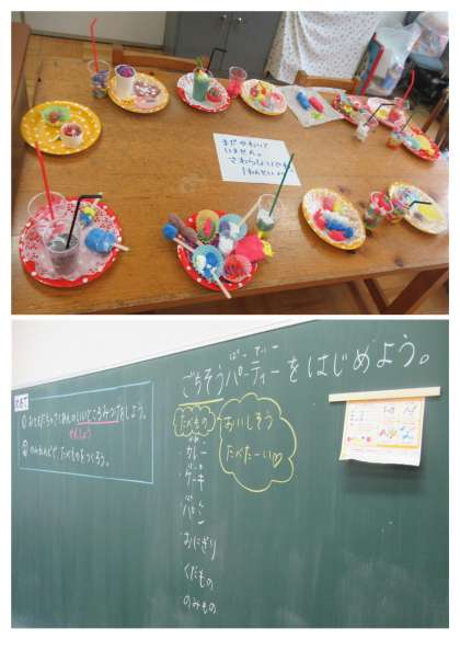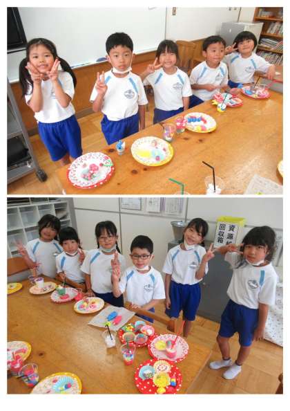 今日、1年生は図工の時間に、「ごちそうパーティをはじめよう」の学習で、4色の紙粘土を使って、食べ物を作りました。4校時、それぞれの作品が出来上がり、自分たちの作品を見せてくれました。どの食べ物も一つ一つ細かいところまで本物のようにていねいに作られていて、おもわず「おいしそう。食べたーい!」と叫んでしまいました。ごちそうさまでした!
