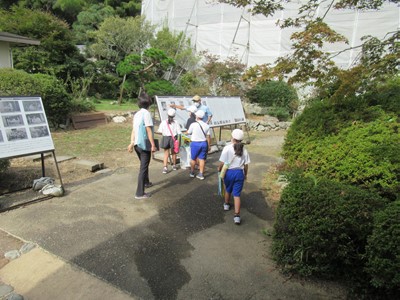 今日の1,2校時に4年生の児童たちは、高山社学の一環として高山社跡見学に行って来ました。