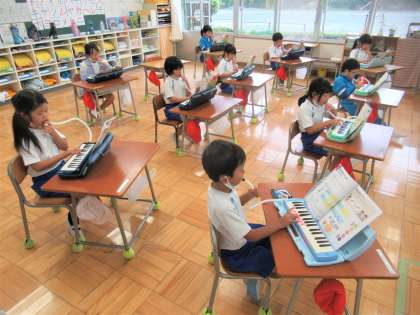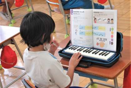 10月5日(水) 1年生の音楽 公開日 2022/10/05 更新日 2022/10/05 できごと 4校時、1年生の音楽では、鍵盤ハーモニカの練習をしていました。親指から小指まで使って演奏します。子供たちは先生の話をよく聞いて、練習に励んでいました。