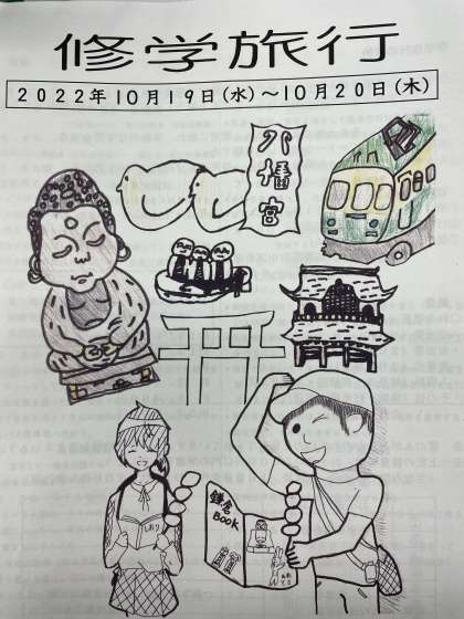 明後日は修学旅行 公開日 2022/10/17 更新日 2022/10/17 できごと 明後日からの修学旅行に向けて、事前学習が終わりました。元気に行って来れることを願っています。写真は全員で作ったしおりの表紙絵です。