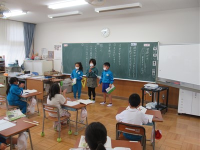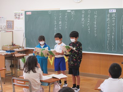 10月18日(火) 2年生の国語 公開日 2022/10/18 更新日 2022/10/18 できごと 2年生の教室では、音読劇の発表会をしていました。 グループごとに好きな場面を選び、音読の仕方を工夫して発表しました。登場人物の気持ちを考え、読み方を考えることで、聴いている人により内容が伝わるということを学習しました。