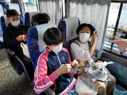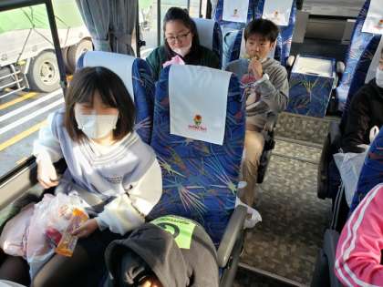 修学旅行〜約束を守って〜 公開日 2022/10/19 更新日 2022/10/19 できごと おやつタイムは、休憩時のバスが止まっている間です。この時は窓を開けて換気をして、おやつを默食しています。みんな満足そうです。