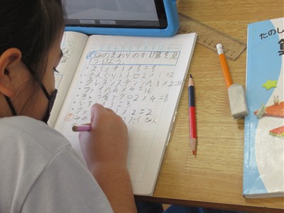 10月20日(木) 2年生の算数 公開日 2022/10/20 更新日 2022/10/20 できごと 2年生の算数の時間です。子どもたちがタブレットを使って校舎内のあちこちを撮影していました。何をしているのかを児童に尋ねると「学校内の『かけ算』を探しているんだよ」と教えてくれました。 教室に戻り、各自が見つけてきた「かけ算」を発表し合いました。 授業のまとめは、子どもたちから出た意見を使って、「身のまわりにはたくさんのかけ算がある」としました。