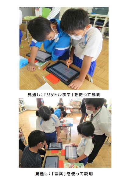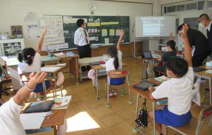 (写真下)グループ共有の後は、積極的に手を挙げ、自信をもって自分の考えを発表する子供たちの姿が見られました。