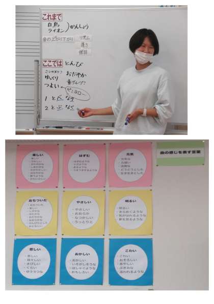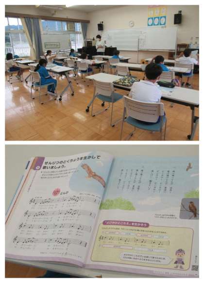 5校時、4年生の音楽では、「旋律の特徴を生かして歌いましょう」の学習で、『とんび』の楽曲を聴いて、曲の感じを言葉で表したり、1番と2番の歌詞で気付いたことを発表したりしていました。このあとは、感じ取った旋律の特徴を意識しながら、歌っていきます。