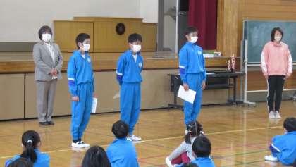 業前活動の時間に、表彰を行いました。各場面で活躍する子供たちを紹介します。おめでとうございます。