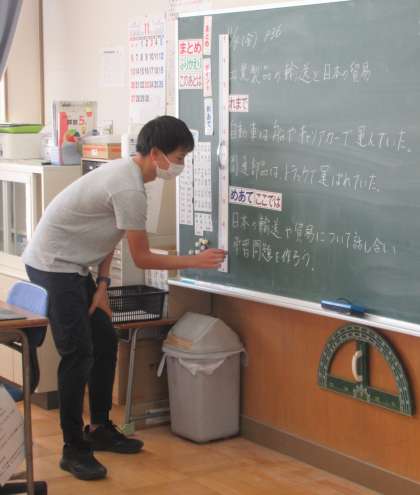 11月4日(金) 5年生の社会 公開日 2022/11/04 更新日 2022/11/04 できごと 3校時、5年生の社会では、単元「工業製品の輸送と日本の貿易」について学習していました。10月31日(月)に校外学習で出かけたスバル自動車工場で学んだことを話題に出しながら、今日の学習を進めていました。