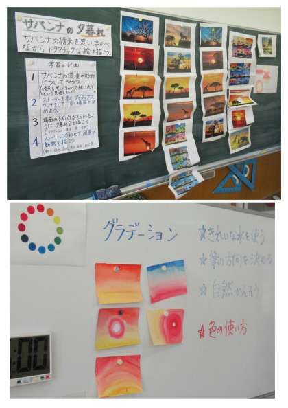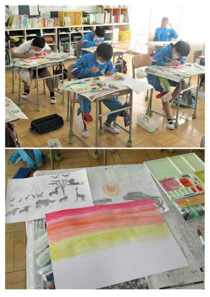11月7日(月) 5年生の図工 公開日 2022/11/07 更新日 2022/11/07 できごと 3校時、5年生の図工では、「サバンナの夕暮れ」の作品づくりに取り組んでいました。今日は、学習計画の3つ目の活動「場面の雰囲気が伝わるように、夕暮れ空を描こう」です。グラデーションの技法に挑戦していました。