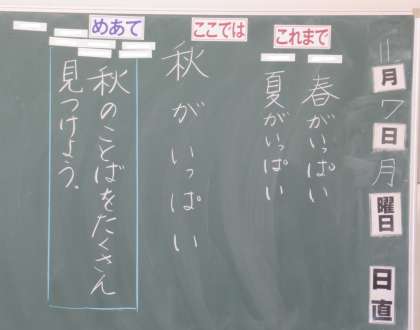 11月7日(月) 2年生の国語 公開日 2022/11/07 更新日 2022/11/07 できごと 4校時、2年生の国語では、『秋がいっぱい』の学習に取り組んでいました。子供たちは、これまでに、生活科で見つけた秋の写真や、音楽で学習した『虫の声』をふり返りながら、自分たちで、今日のめあて「秋のことばをたくさん見つけよう」を考えました。子供たちの主体的な学習が進められています。