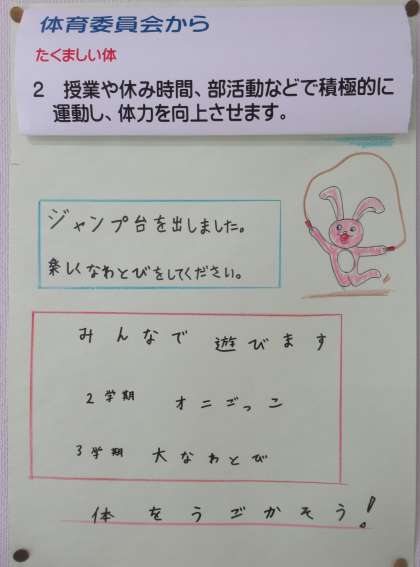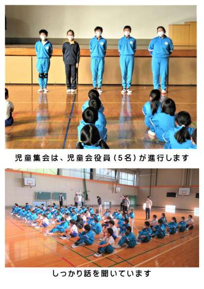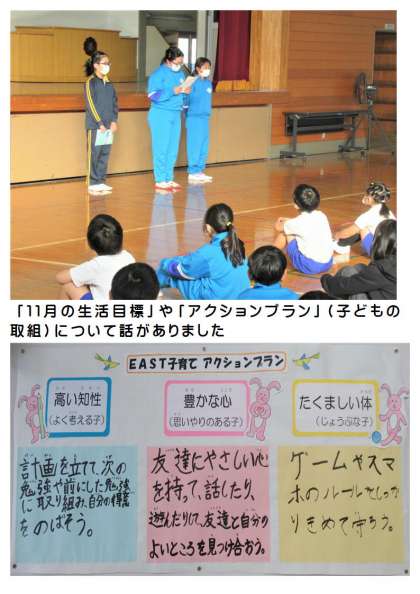 11月11日(金) 児童集会〜「EAST子育てアクションプラン(子どもの取組)」の呼びかけ〜 公開日 2022/11/11 更新日 2022/11/11 できごと 業前活動の時間に、児童集会を行いました。今日は、児童会役員や体育委員長より、「11月の生活目標」や「EAST子育てアクションプラン(子どもの取組)」についての呼びかけがありました。