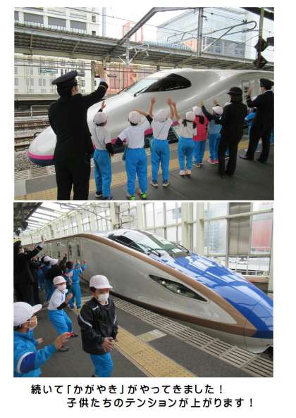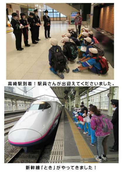 11月15日(火) 2年生校外学習「高崎駅に行こう」(2) 公開日 2022/11/15 更新日 2022/11/15 できごと 高崎駅の駅員さんたちにお世話になり、新幹線ホームを見学しました。「とき」や「かがやき」を目の前にして、子供たちは大興奮だったようです。タイムリーに「はやぶさ」も通過しました。駅員さんいわく、「はやぶさ」が見られたのはラッキーだそうです。
