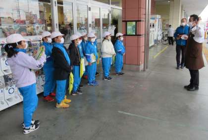 3年生社会科の校外学習「コープ藤岡店」の見学、買い物体験の様子をお伝えします。まずは、美九里西小学校3年生を歓迎するのぼり旗が飾られていて感激しました。副店長さんに店内やバックヤード(倉庫)を説明していただきながら見学しました。