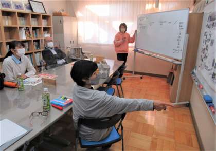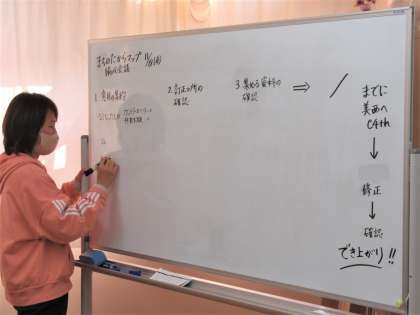 今日は、夏休み中に概ね作り上げた原案を、2学期に各校で検討した修正点等を確認していました。ホワイトボードには、いよいよ「できあがり!」の文字が書かれています。今年度末の完成までもうすぐです。