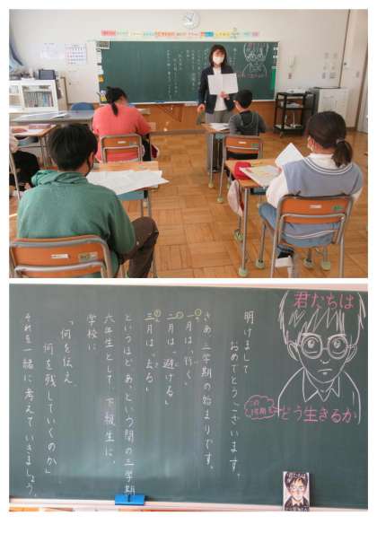 1月10日(火) 6年生の学級活動 公開日 2023/01/10 更新日 2023/01/10 できごと 2校時、6年生は、担任より「卒業までの3学期をどう過ごすか〜6年生として、下級生に、学校に、何を伝え、何を残していくのか・・について一緒に考えていきましょう!」というエールを受け取りました。6年生と美九里西小学校で過ごす3学期(51日間)、全校のみんなで、一日一日を大切に過ごしていきたいと思います。