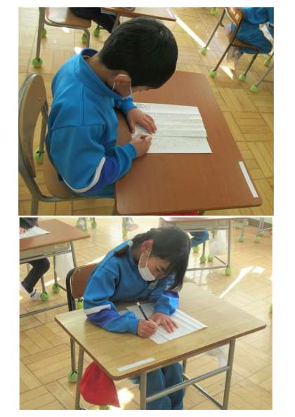 1月11日(水) 書き初め大会(1年生)1 公開日 2023/01/11 更新日 2023/01/11 できごと 今日は、全学年で「書き初め大会」を行いました。子供たちが書に向かう真剣な様子を全学年紹介します。1年生は、硬筆です。
