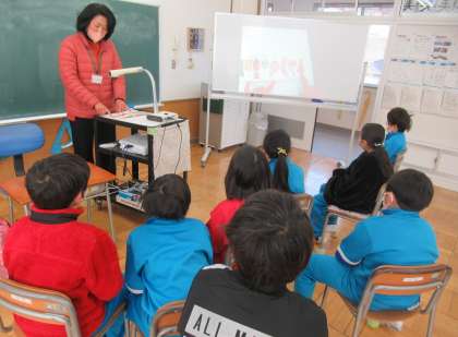 1月12日(木) 読み聞かせ(4年生) 公開日 2023/01/12 更新日 2023/01/12 できごと 4年生は、英語の絵本の読み聞かせです。「藤岡・リジャイナかけ橋プロジェクト(絵本の交流)」が広がっています。