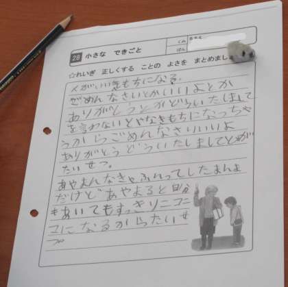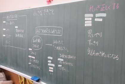 1月13日(金) 2年生の道徳 公開日 2023/01/13 更新日 2023/01/13 できごと 5校時、2年生の道徳では、読み物資料「小さなできごと」を読んで、礼儀正しくすることのよさについて考えました。子供たちは、ワークシートに自分の考えを書き、進んで発表していました。黒板は、子供たちの考えでいっぱいになりました(白い部分には、ネームプレートが貼られています)。