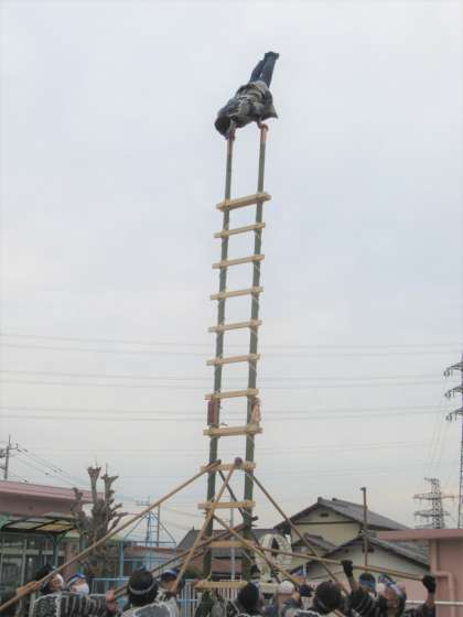 1月13日(金) 藤岡若鳶会「新春はしごのり」(2) 公開日 2023/01/13 更新日 2023/01/13 できごと いよいよはしごに乗って、華麗な技が披露されました。技がきまるごとに、拍手喝采です。