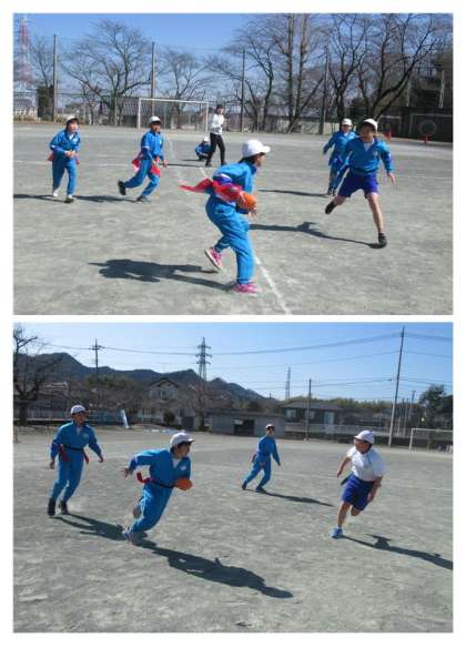 春一番が吹き寒かった昨日とはうってかわり、暖かな日差しに恵まれた今日の5校時、5・6年生が校庭で「タグラグビー」を行っていました。