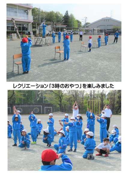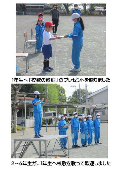 みんなでレクリエーション「3時のおやつ」をして楽しみました。そのあと、1年生に「校歌の歌詞」が贈られ、2〜6年生が元気よく校歌を歌って1年生を迎えました。4校時には、1年生教室に2年生が来て、校歌を歌ってくれたようです。1年生は給食を食べた後、上級生から贈られた「校歌の歌詞」を見て、校歌の練習を始めました。