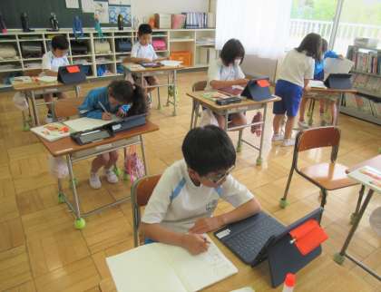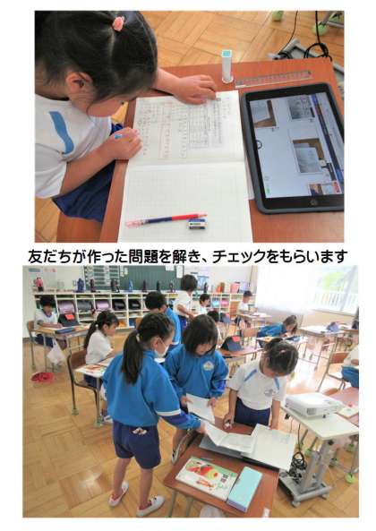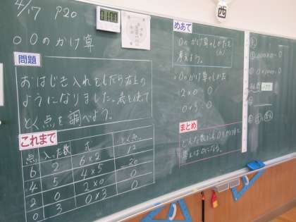 4月17日(月) 3年生の算数 公開日 2023/04/17 更新日 2023/04/17 できごと 3年生の算数では、「0のかけ算」について学習していました。友だちの作った問題を解き合い、「どんな数にも0をかけると答えは0になる」ことを確認(まとめ)しました。