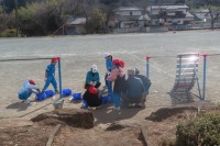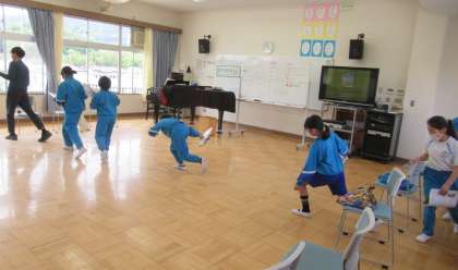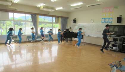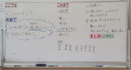 5年生の音楽の時間、音楽室に行ってみると、5年生が先生と列になって、『こいのぼり』を歌いながら、体を動かしています。板書を見てみると、「風がなく、低くとんでいる感じ」「風が吹き、高くとんでいる感じ」を体で表現しながら、曲想を感じ取る実験をしているところでした。確かに、体の動きがはずんでくると、子どもたちの歌声が軽やかになり、こいのぼりが空高くとんでいる様子が伝わってきます。おもしろい音楽の実験でした。