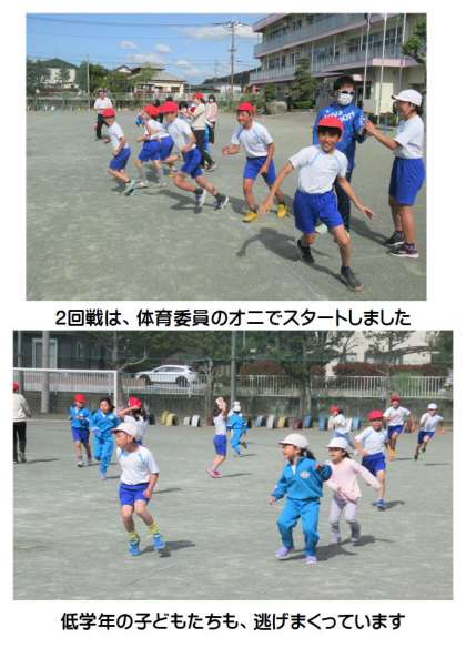 5月2日(火) 児童集会 公開日 2023/05/02 更新日 2023/05/02 できごと 業前活動の時間に、「児童集会」を行いました。各専門委員会からの連絡のあと、全校のみんなで「増えオニ」をしました。オニ(赤色帽子)につかまると、どんどんオニが増えていきます。子どもたちは、朝から楽しそうに校庭中を走り回りました。みんな元気いっぱいです!