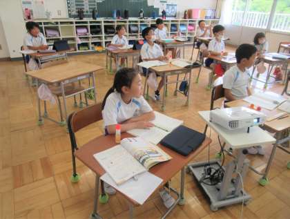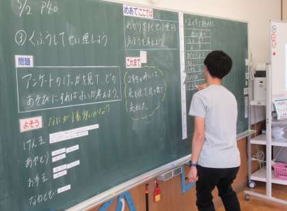 3年生の算数では、「工夫してせいりしよう」の学習を行っていました。みんなの好きな遊びが書かれたアンケート用紙を「正」の字を使って表にまとめていました。2年生の時に、表に〇をつけて数を比べた学習が、ここでの学習のヒント(つなぎ教材)になりました。