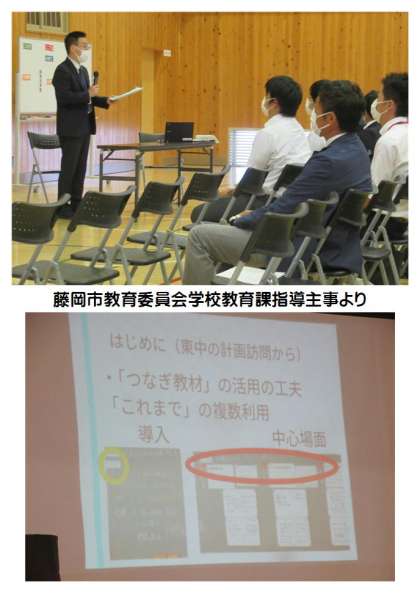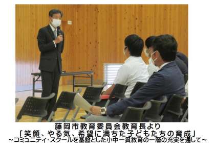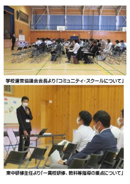 本日午後、東中学校において、東中校区4校の全教職員が集まり、「第1回合同研修会」を行いました。全体研修では、講師として田中教育長様、学校教育課指導主事様より講話をいただきました。また、学校運営協議会より会長をはじめ3名の委員の皆様にもご参加いただきました。