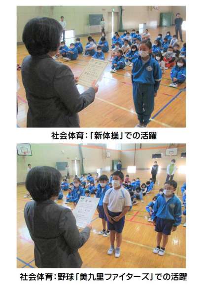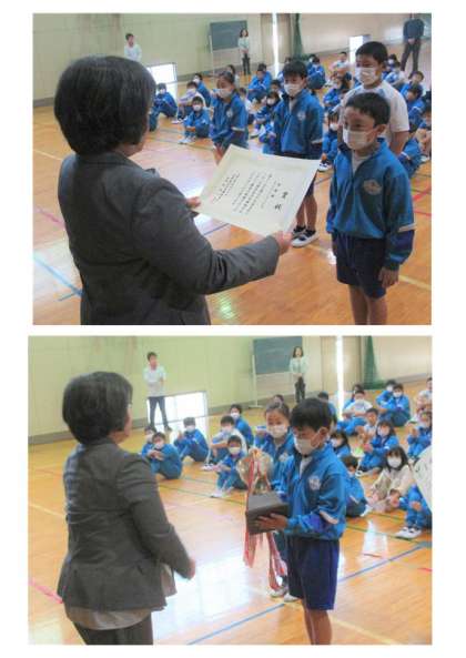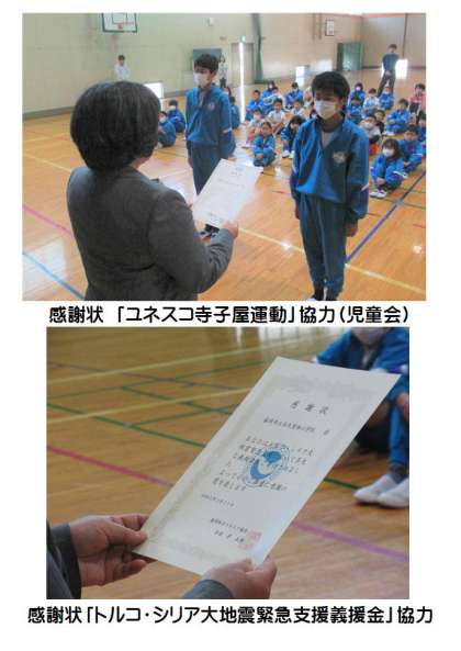 5月9日(火) 表彰 公開日 2023/05/09 更新日 2023/05/09 できごと 業前活動の時間に、表彰を行いました。児童会を中心として行っている1円玉募金や書き損じハガキ等の協力、今年3月にご協力いただいた「トルコ・シリア大地震緊急支援」の協力に対して、ユネスコ協会より感謝状をいただきました。 また、社会体育で活躍している子どもたちの表彰も行いました。おめでとうございます。
